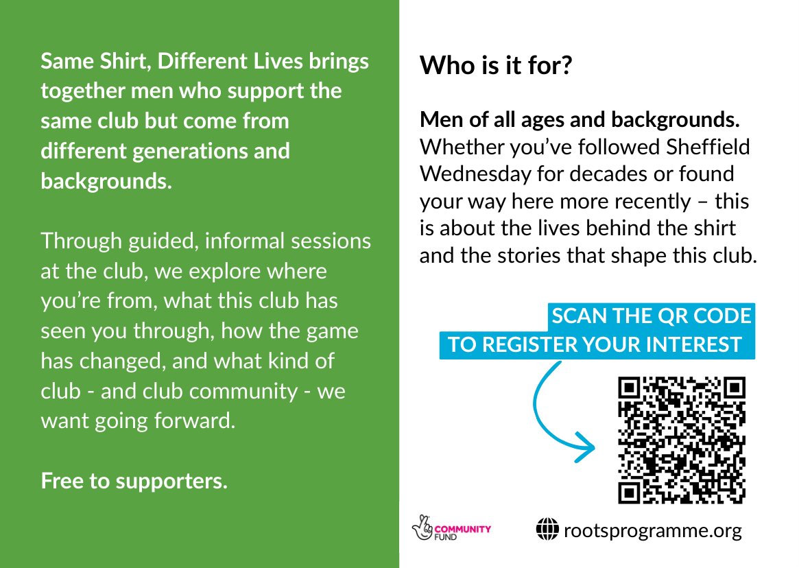 Football brings thousands of people together every week, but supporting the same club doesn’t always mean feeling connected to other supporters. Same Shirt, Different Lives is a new pilot programme by The Roots Programme being delivered in partnership with Sheffield Wednesday Football Club using a shared love of the club as a starting point to bring fans together beyond matchday.